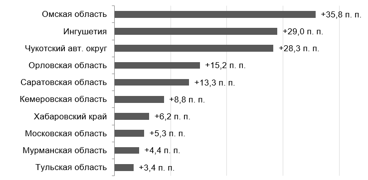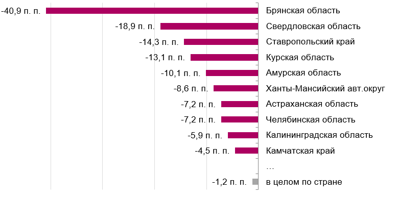 За прошедший год половина регионов (44) смогли сократить долю отходов, направляемых на полигоны для захоронения, и нарастить утилизацию мусора. Лучшую динамику продемонстрировала Брянская область, где доля захораниваемых отходов сократилась на 40,9 п. п., до 56,4% (годом ранее закапывалось 97,3% мусора, то есть практически все сгенерированные ТКО). Далее с большим отрывом следуют Свердловская область (−18,9 п. п., до 75,9%), Ставропольский край (−14,3 п. п., до 64,8%), Курская область (−13,1 п. п., до 85,2%), Амурская область (−10,1 п. п., до 73%), Ханты-Мансийский автономный округ (−8,6 п. п., до 90,6%), Астраханская область (−7,2 п. п., до 80,8%), Челябинская область (−7,2 п. п., до 86,3%), Калининградская область (−5,9 п. п., до 93,9%), а также Камчатский край (−4,5 п. п., до 67%).