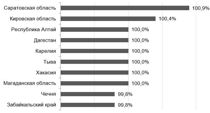 В результате за неполный 2023 год о наибольшей доле ТКО, направленных на захоронение, отчитались Саратовская и Кировская области. Их показатели превысили 100% и составили 100,9% и 100,4% (причиной может служить то, что на полигон отправился мусор, накопленный за предыдущие периоды, в частности при ликвидации нелегальных свалок).