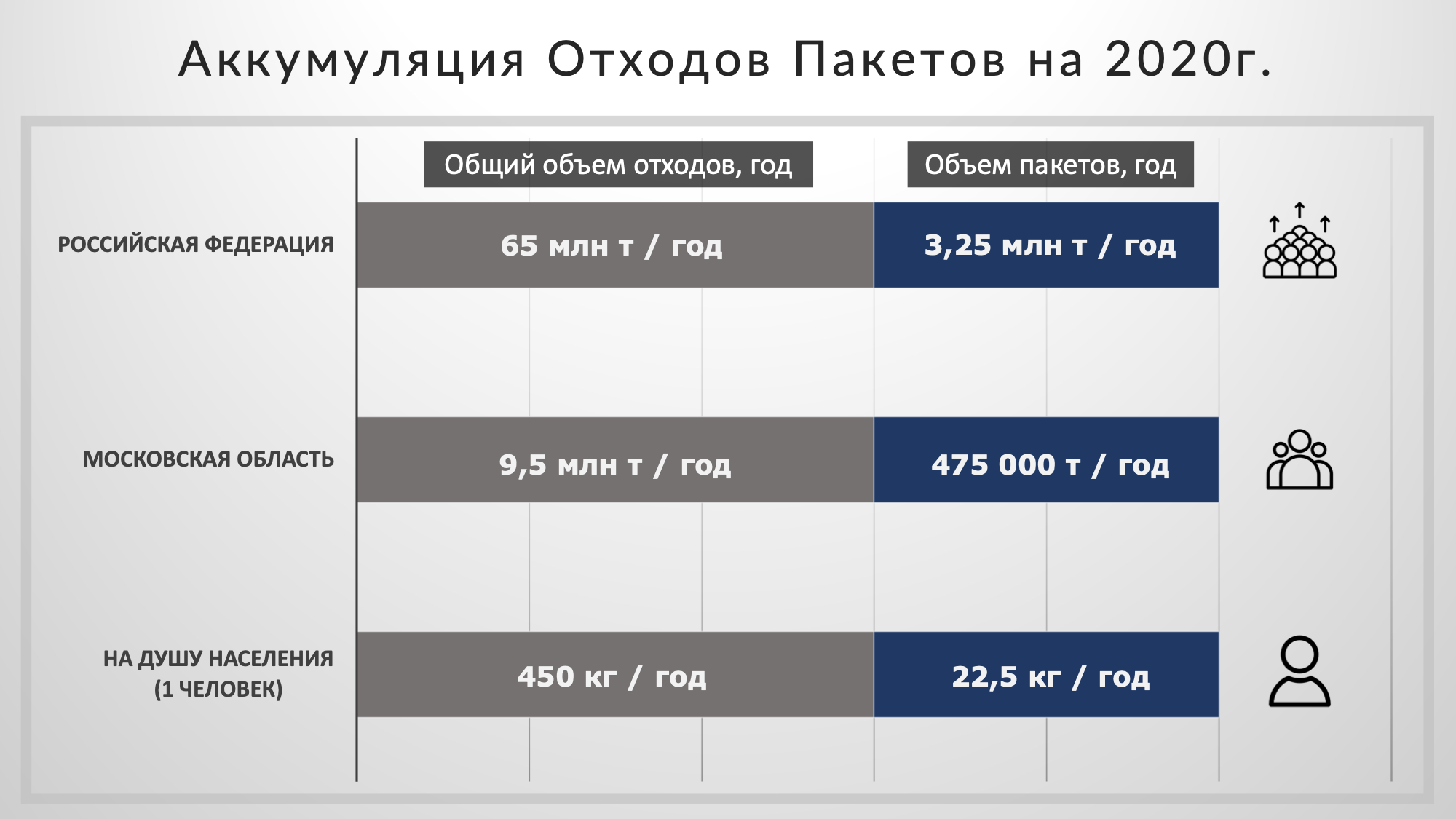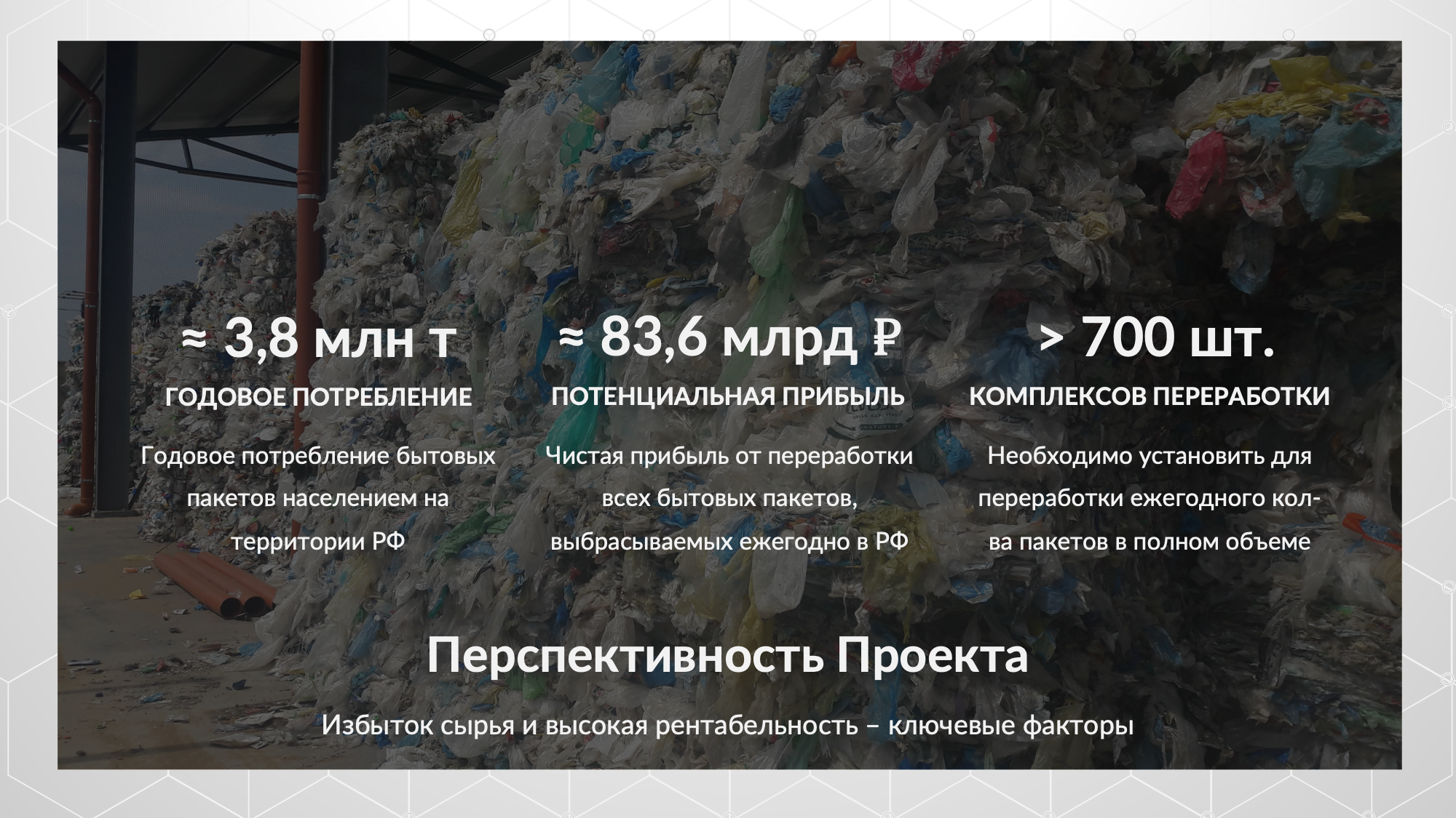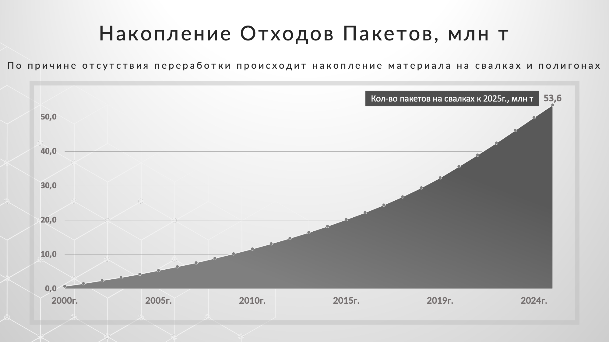Исходя из наших расчетов, мы видим, что на свалках уже накопилось около 46 миллионов тонн пленочных отходов, включая пакеты. Этот значительный избыток сырья предоставляет нам уникальную возможность прогнозировать потенциальную прибыль от переработки таких отходов.