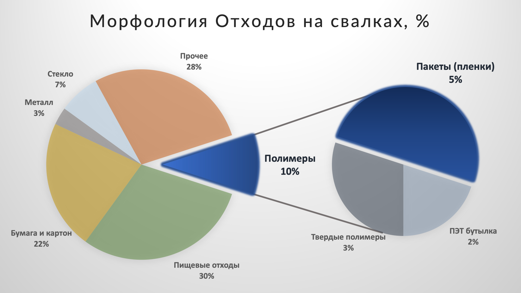 Согласно данным, полученным из официального источника "Российский Экологический Оператор", результаты морфологического исследования видов отходов показали, что доля полимерных отходов составляет приблизительно 10%. Исходя из нашего личного опыта работы с полимерами, мы можем подтвердить, что пленки (кульки и пакеты) являются значительной частью, составляя примерно 50% от общей массы полимерных отходов.