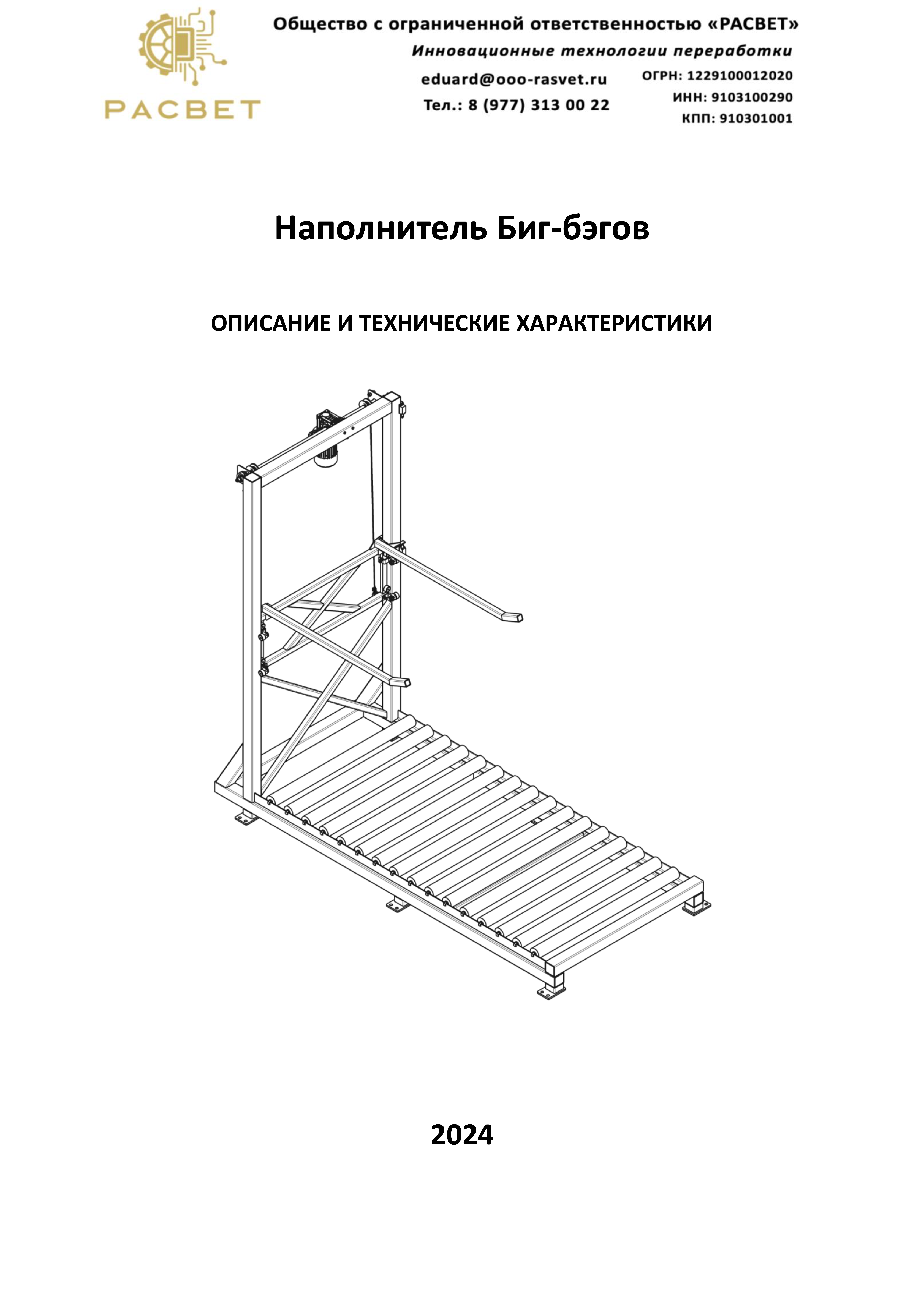 Наполнитель Биг-Бэгов — предназначен для заполнения одного или последовательного заполнения двух мешков типа BIG-BAG. После того как один мешок заполнен, он сдвигается по рольгангу, а на его место подвешивается другой пустой мешок. Крепление мешков BIG-BAG осуществляется с помощью лямок на зацепы подвижной каретки. Положение каретки контролируется датчиками, которые определяют крайние верхнее и нижнее положения каретки.