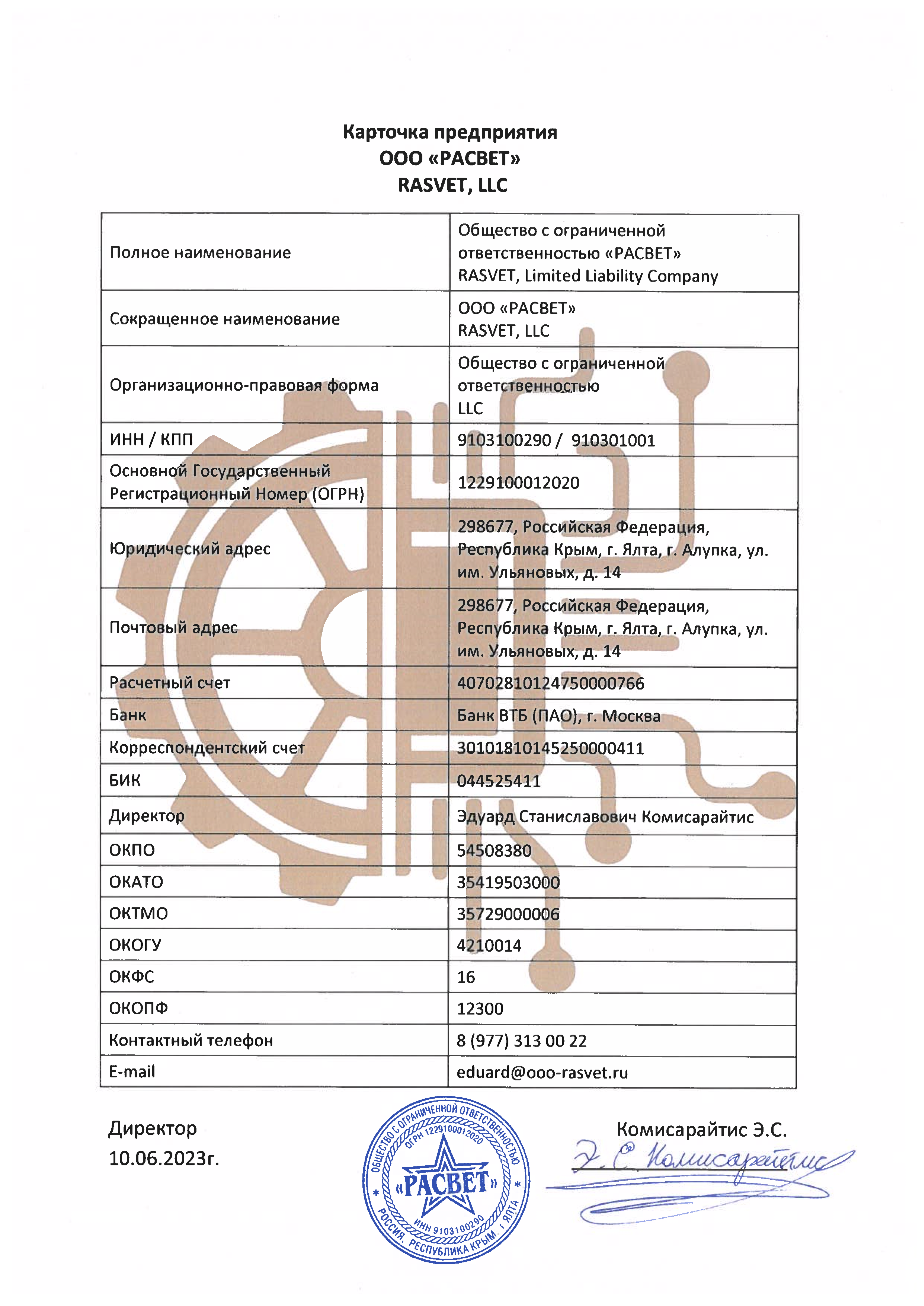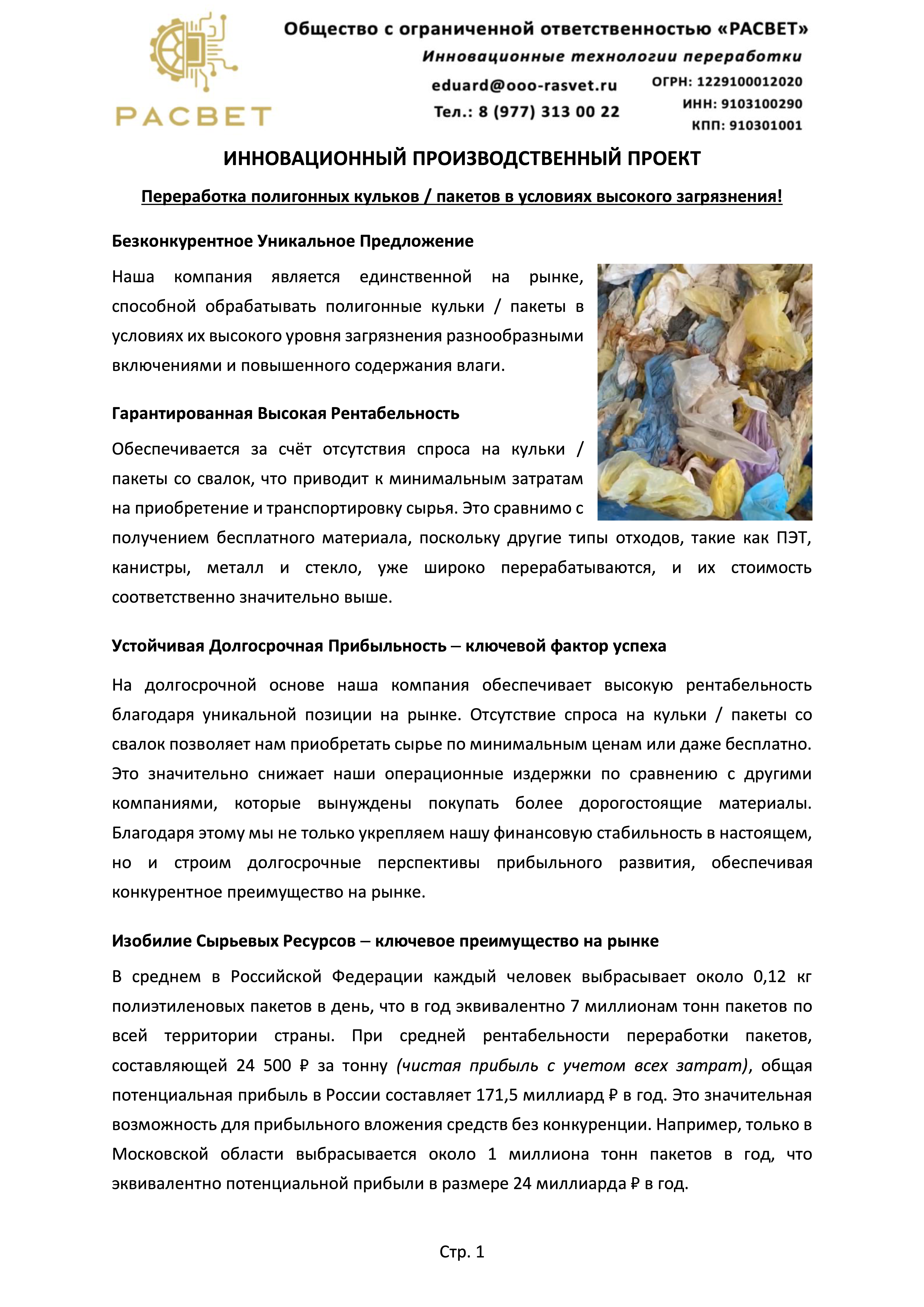 Карточка Предприятия "РАСВЕТ" - В карточке предприятия представлена информация о реквизитах, расчетных счетах, контактных данных и регистрационных номерах нашей компании. Это новое предприятие, созданное нашей командой с особым уклоном на развитие переработки полигонных кульков / пакетов на территории Российской Федерации.