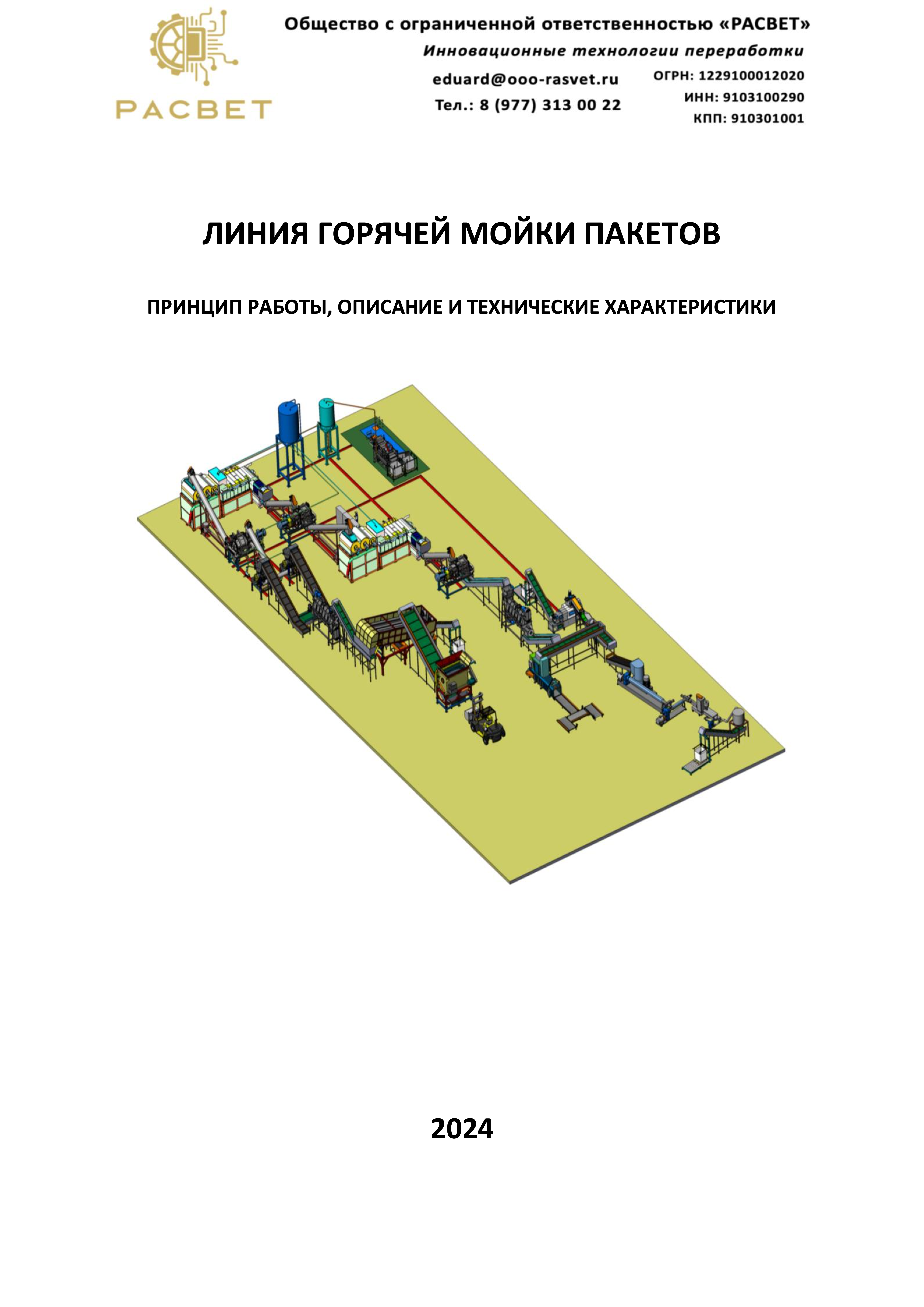 Техническое описание представляет собой детальное описание работы линии, которая предназначена для мойки полиэтиленовых пакетов и производства гранулы ПЭ. В документе изложена концепция работы линии, последовательность этапов отмывки пакетов, комплектация и оснащенность линии, основные показатели эффективности, а также описание сырья на входе и готовой продукции на выходе.