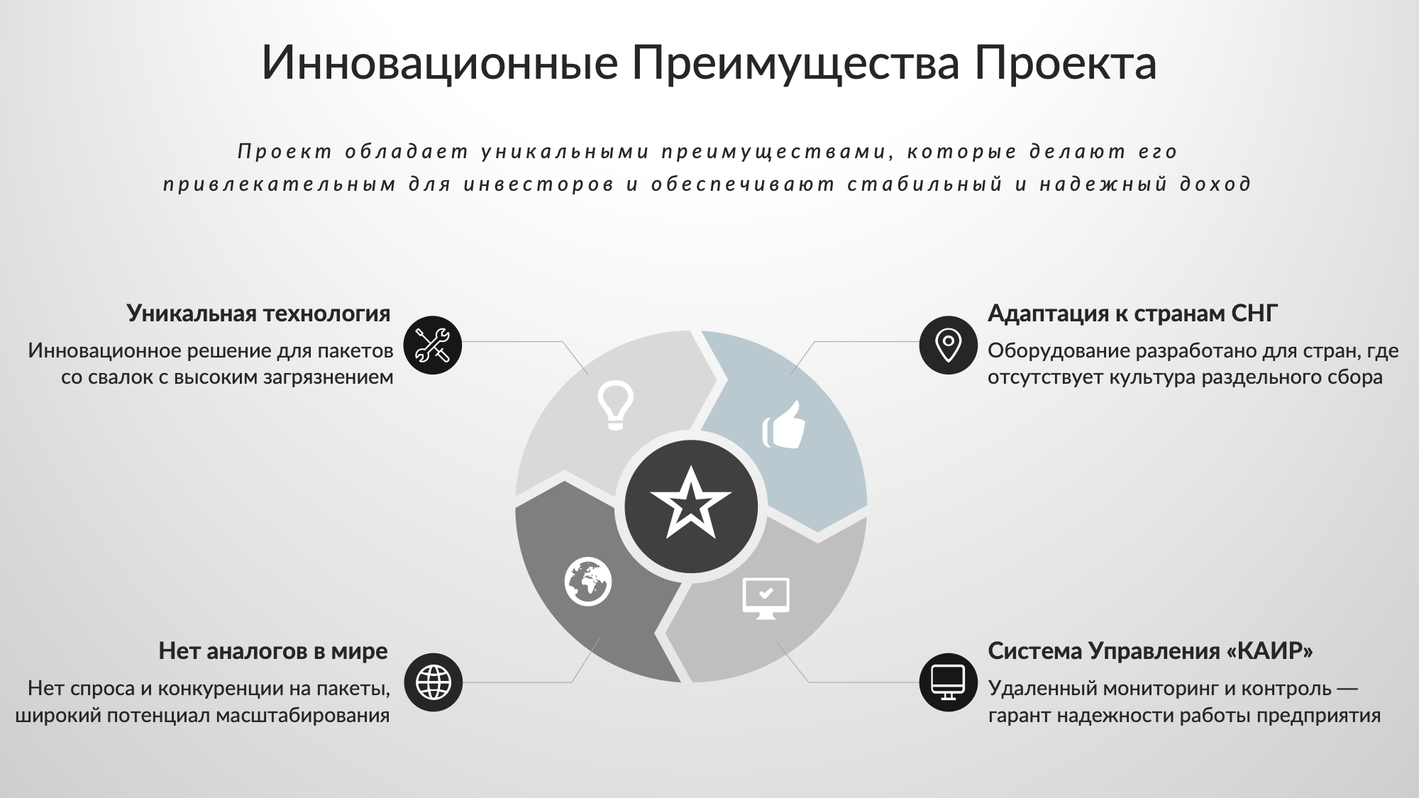 Все эти факторы в совокупности делают наш проект уникальным и инновационным в сфере переработки бытовых пакетов.