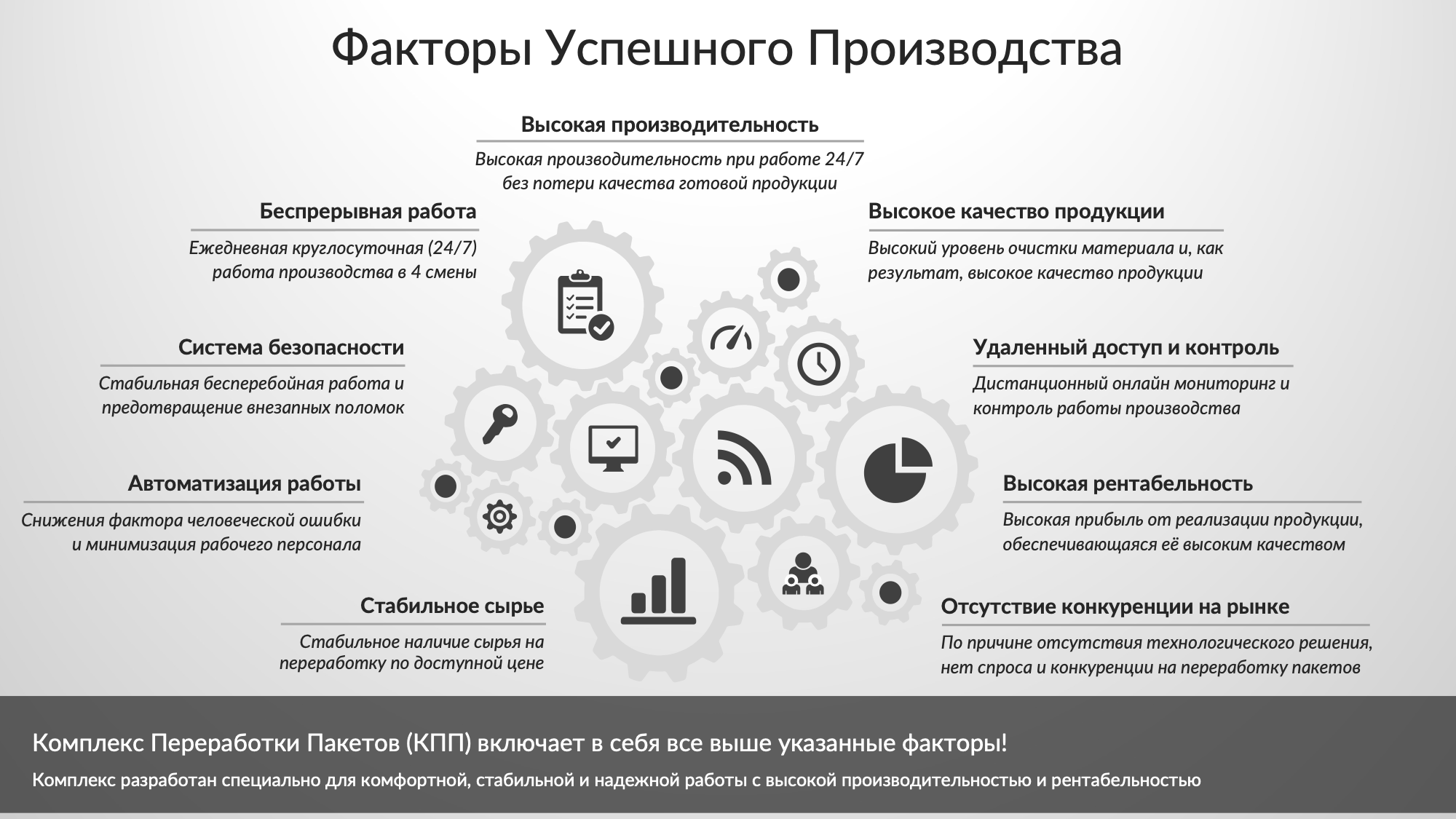 Все перечисленные выше факторы объединяются в единую систему, которая обеспечивает стабильную высокую рентабельность предприятия. Наше производство включает в себя все эти ключевые компоненты и гарантирует успешное и прибыльное функционирование бизнеса.