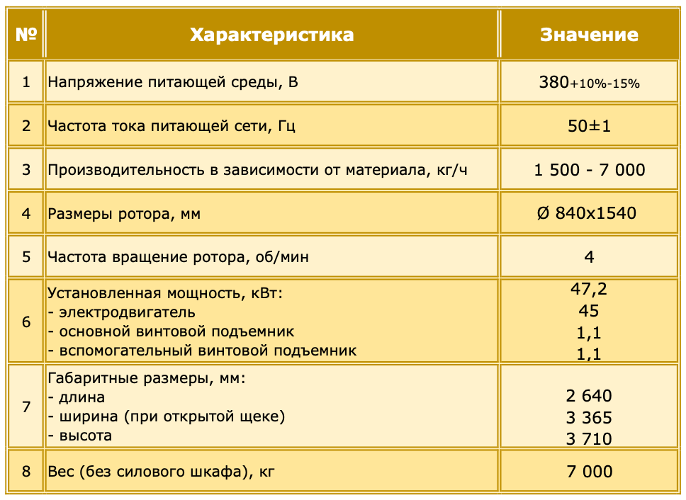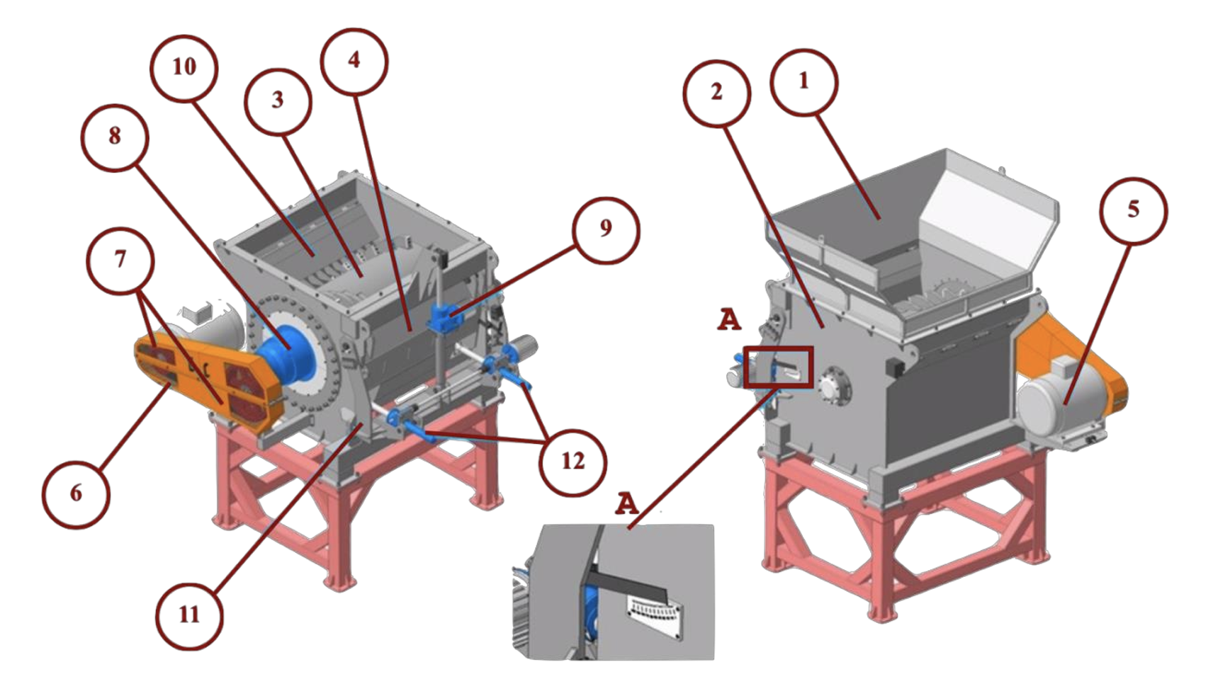 Основные элементы: 1 – загрузочный бункер; 2 – корпус; 3 – ротор; 4 – щека; 5 – электродвигатель; 6 – ременная передача; 7 – кожухи; 8 – редуктор; 9 – основной винтовой подъемник; 10 – гребень; 11 – упор щеки; 12 – вспомогательные винтовые подъемники.