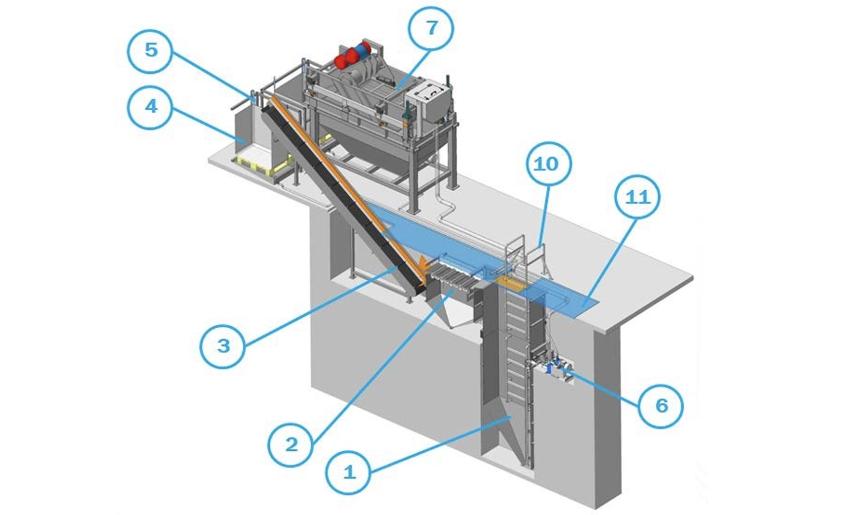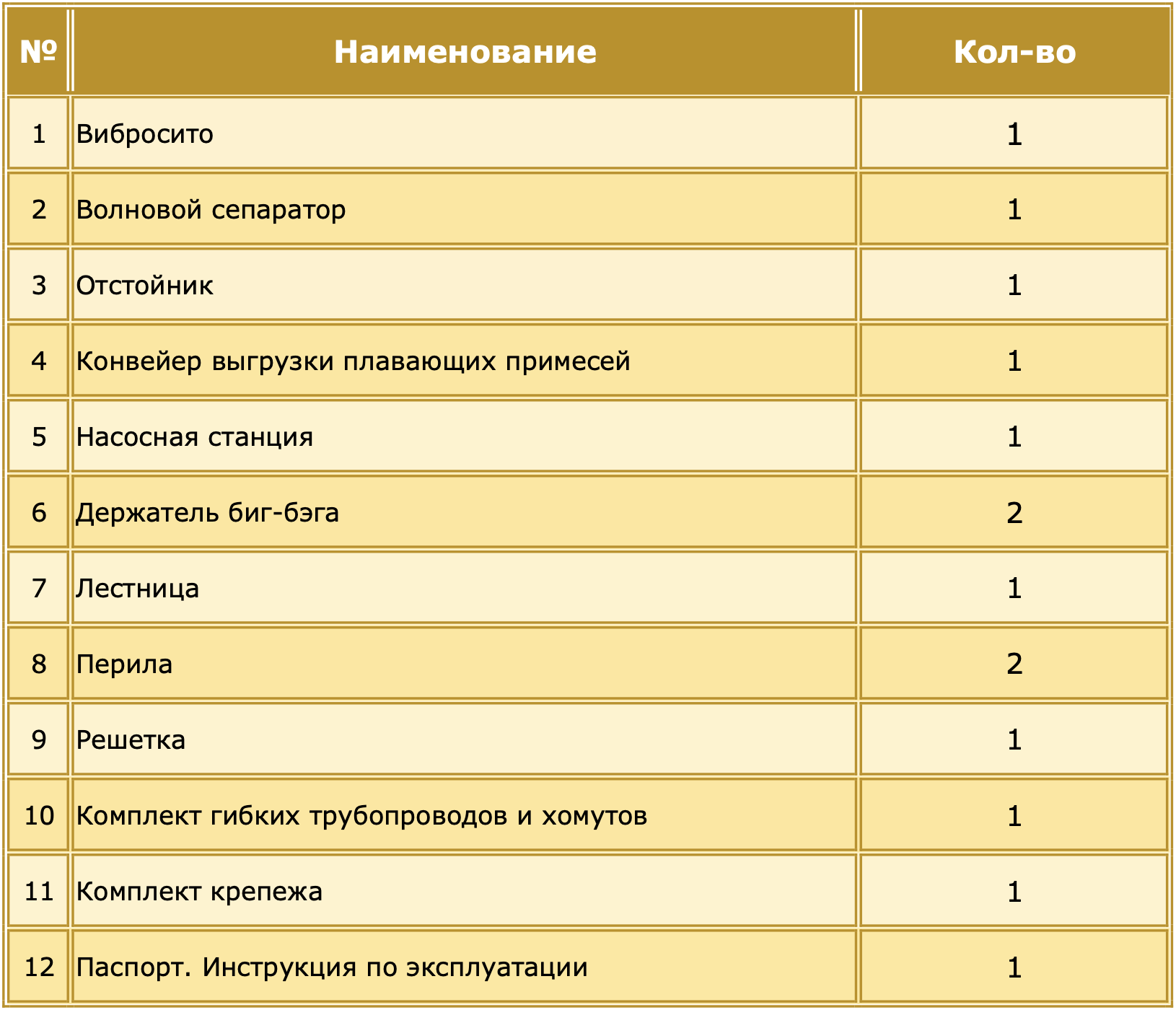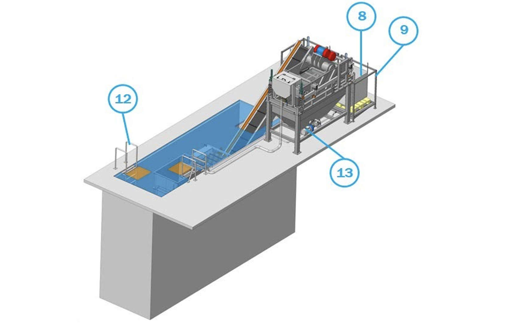 Основные элементы: 1 – отстойник; 2 – волновой сепаратор; 3 – ленточный транспортер; 4 – биг-бэг; 5 – держатель биг-бэга; 6 – насосная станция; 7 – вибросито; 8 – биг-бэг; 9 – держатель биг-бега; 10 – перила; 11 – решетка; 12 – лестница; 13 – насос вибросита.