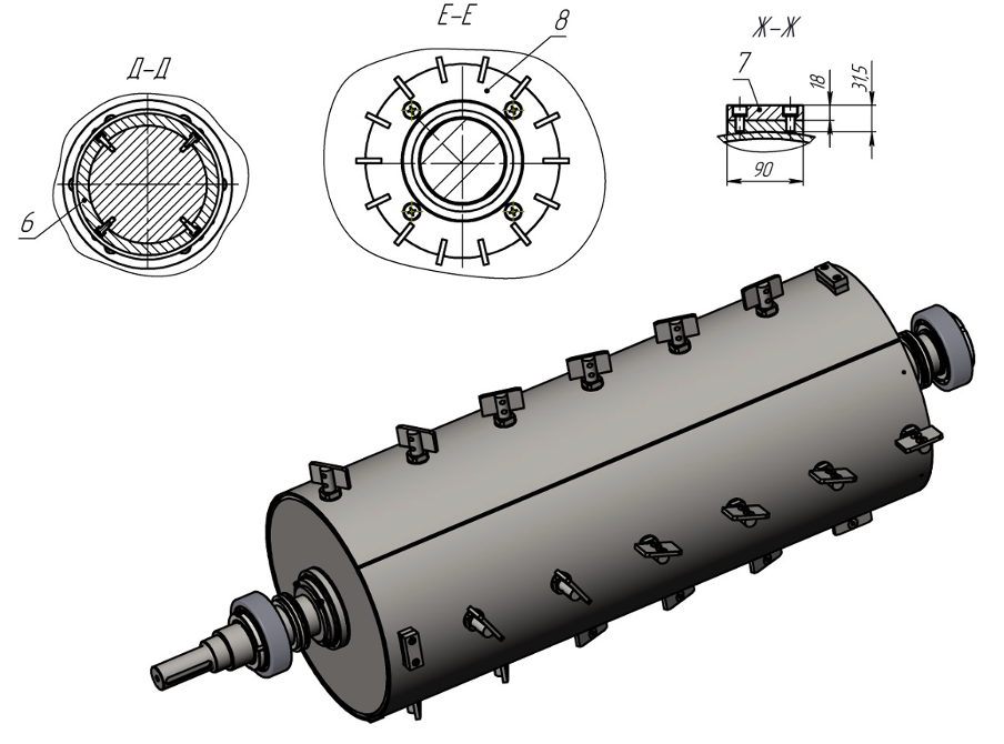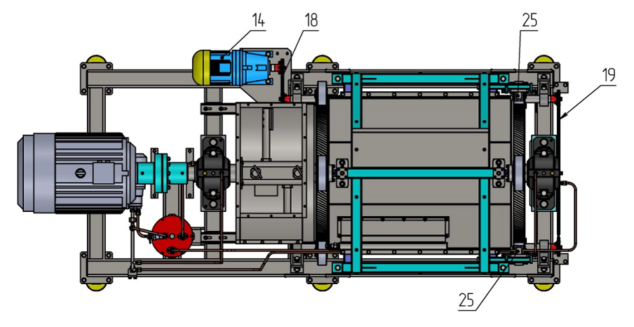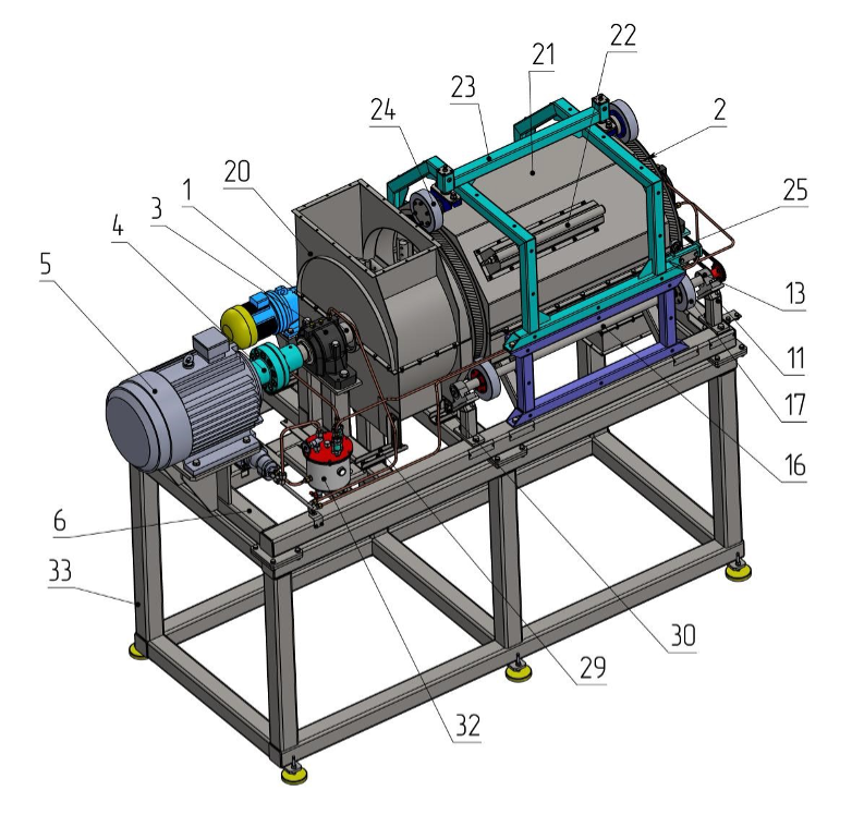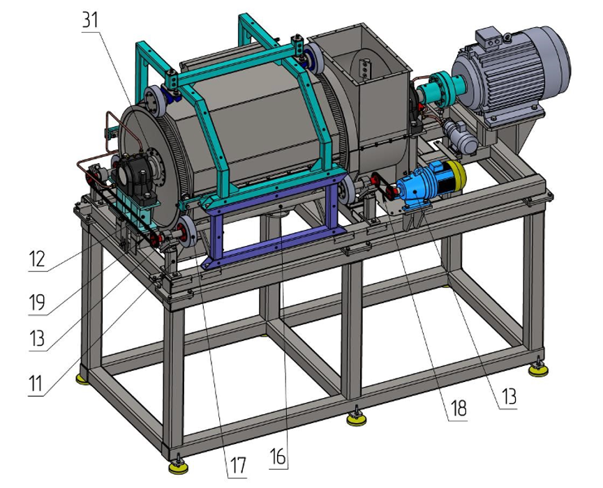 Основные элементы: 1 – Ротор; 2 – Барабан; 3 – Корпус подшипника (доработка SNN 522-619) (2 шт.); 4 – Муфта МУВП 1000-60-1 УЗ ГОСТ 21424; 5 – Электродвигатель X3-225S- (4 шт.) 37кВт, 1480 об/мин; 6 – Рама; 7 – Кожух нижний; 8 – Бункер выгрузки; 9 – Бункер сливной; 10 – Жёлоб; 11 – Постель (4 шт.); 12 – Постель съёмная; 13 – Подшипник корпусной UCP-206 (4шт.); 14 – Мотор-редуктор ЗМП 31,5-16-0,37; 15 – Вал катков (2 звёздочки, 2 ролика); 16 – Вал катков (1звёздочка, 2 ролика); 17 – Ролик опорный (4 шт.); 18 – Цепь ПР-12,7-18,2-1 (50 звеньев); 19 – Цепь ПР-12,7-18,2-1 (156 звеньев); 20 – Крышка жёлоба; 21 – Кожух верхний; 22 – Коллектор форсуночный; 23 – Скоба прижимная; 24 – Ролик прижимной (2 шт.); 25 – Фиксатор барабана (2 шт.); 26 – Лабиринтное уплотнение TS 522 U (NSK); 27 – Кольцо фиксирующее SR 200-13,5 (NSK) (2 шт.); 28 – Крышка торцевая 522А (NSK); 29 – Кронштейн (2шт); 30 – Кронштейн (2шт.); 31 – Сегмент (2шт.); 32 – Система смазки; 33 – Подставка.