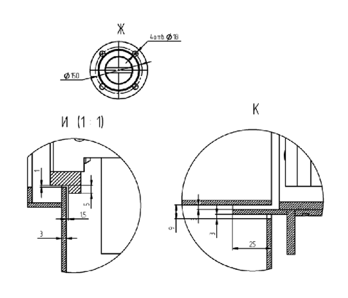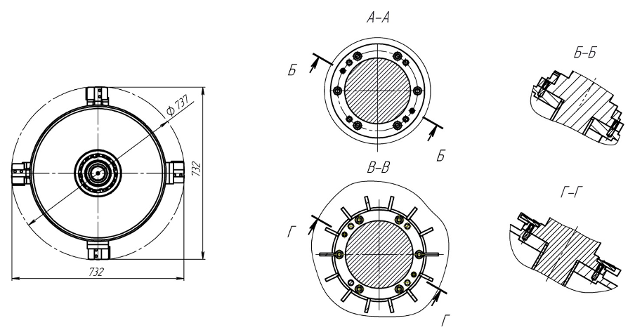 Расположение втулок аналогично расположению резьбовых отверстий в роторе (1). На концах внутренней трубы после сварки сделаны соосные расточки для установки цапф. На краях обечайки с противоположных сторон установлены площадки для крепления противовесов.