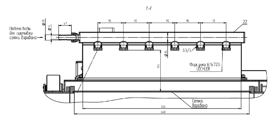 Одновременно с этим, вода подается извне с помощью форсунок и омывает внешнюю сторону сетчатого барабана. Это позволяет смыть включения, которые оказались на внешней поверхности сетки, и удалить их из зоны вращения барабана.