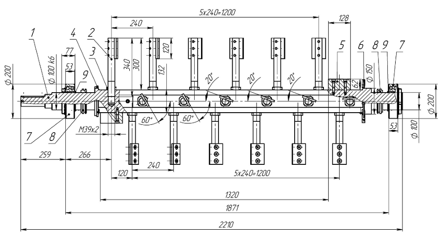 Основные элементы: 1 – Вал ротора; 2 – Лопатка (24 шт.); 3 – Гайка (24 шт.); 4 – Втулка лабиринтная; 5 – Противовес (4 шт.); 6 – Отражатель; 7 – Подшипник 2222k+H322 (NSK) (2 шт.); 8 – Лабиринтное уплотнение TS522U (NSK) (2 шт.); 9 – Кольцо С100 ГОСТ 13942-86 (2шт).