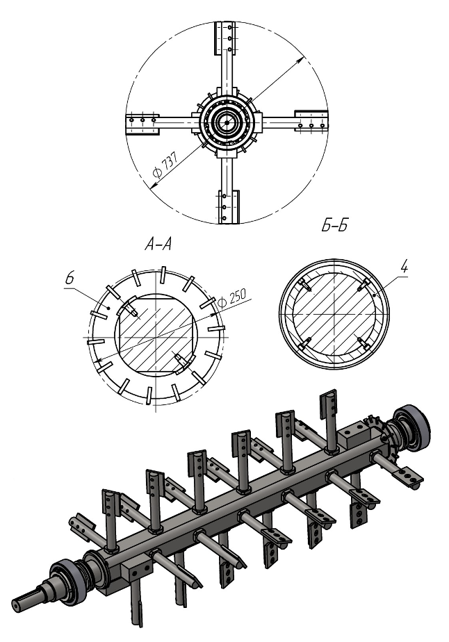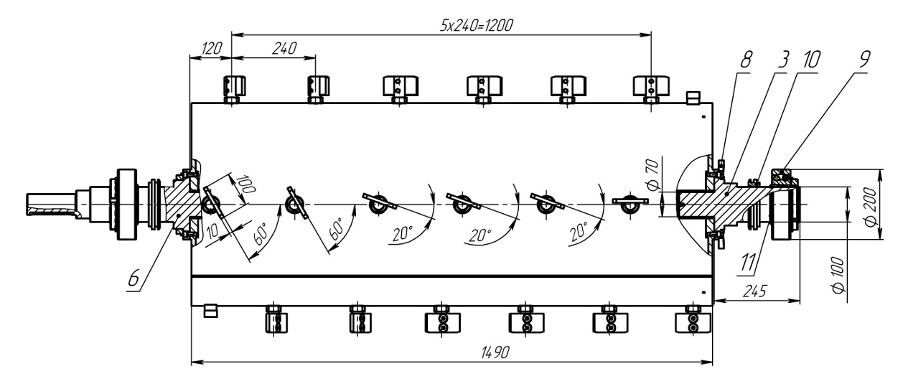 Основные элементы: 1 – Держатель лопаток; 2 – Цапфа передняя; 3 – Цапфа задняя; 4 – Лопатка (24 шт.); 5 – Гайка (24 шт.); 6 – Втулка лабиринтная; 7 – Противовес (4 шт.); 8 – Отражатель; 9 – Подшипник 2222k+H322 (NSK) (2шт.); 10 – Лабиринтное уплотнение TS522U (NSK) (2 шт.); 11 – Кольцо С100 ГОСТ 13942-86 (2шт.).