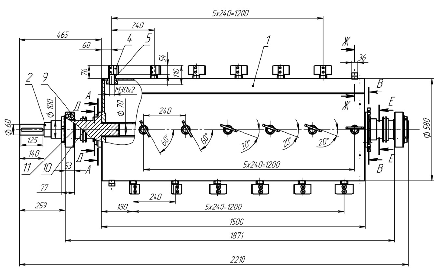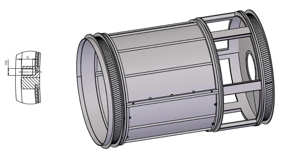 Конструктивно барабан состоит из двух секций и двух держателей сетки. Секция 1 представляет собой сварную конструкцию, состоящую из цилиндрической обечайки (3), фрикционной обечайки (1) с двумя кольцами (2), обечайки (4) и фланца (7) с шестью вваренными шпильками. Фрикционная обечайка имеет по всей окружности насечки, увеличивающие сцепление с сопрягаемыми роликами, на которые опирается барабан. Кольца (2) на краях фрикционной обечайки, кроме придания жёсткости, дополнительно служат ограничителями осевого перемещения барабана.