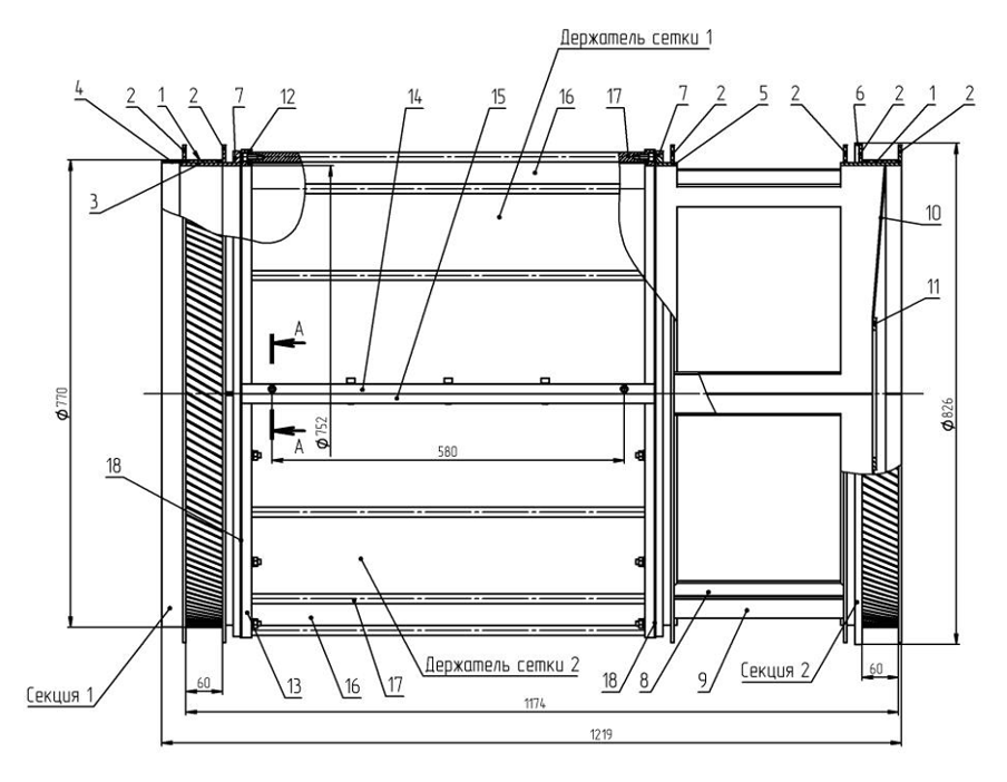 Держатель сетки (2) состоит из двух боковых фланцев (13), двух продольных соединительных фланцев (15), сетки (16) и пяти стержней (17). Съёмная сетка (16) из нержавеющего стального полотна толщиной 2мм и диаметром отверстий 2мм представляет собой полуцилиндрическую обечайку, входящую при монтаже своими кромками в соответствующие пазы фланцев (13,15). Соединительные фланцы (15) имеют по (3) резьбовых отверстия для крепления с держателем сетки (1) и по два отверстия по краям для соединения с боковыми фланцами (13). Боковой фланец представляет собой полукольцо с отверстиями для стягивания фланцев между собой и для крепления держателя сетки (2) с секциями 1,2. При монтаже держателя сетки (при установленной сетке) боковые фланцы (13) через резьбовые отверстиями на торцах соединяется с соединительными фланцами (15). Дополнительно боковые фланцы (13) стягиваются между собой пятью продольными стержнями (17) через их резьбовые отверстия. Касаясь сетки, стержни (17) придают ей жёсткость в радиальном направлении. Держатель сетки (2) крепится на фланцах (7) секций 1,2 через полукольца (18) (толщиной 2мм).