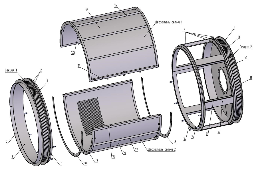 Основные элементы: 1 – Обечайка фрикционная (2 шт.); 2 – Кольцо (6 шт.); 3 – Обечайка цилиндрическая; 4,5,6 – Обечайка; 7 – Фланец (2 шт.); 8 – Пластина (12 шт.); 9 – Пластина покрывная (6 шт.); 10 – Тарелка; 11 – Кольцо; 12,13 – Фланец боковой (2 шт.); 14,15 – Фланец соединительный (2 шт.); 16 – Сетка съемная; 17 – Стержень (10 шт.); 18 – Полукольцо (2 шт.).
