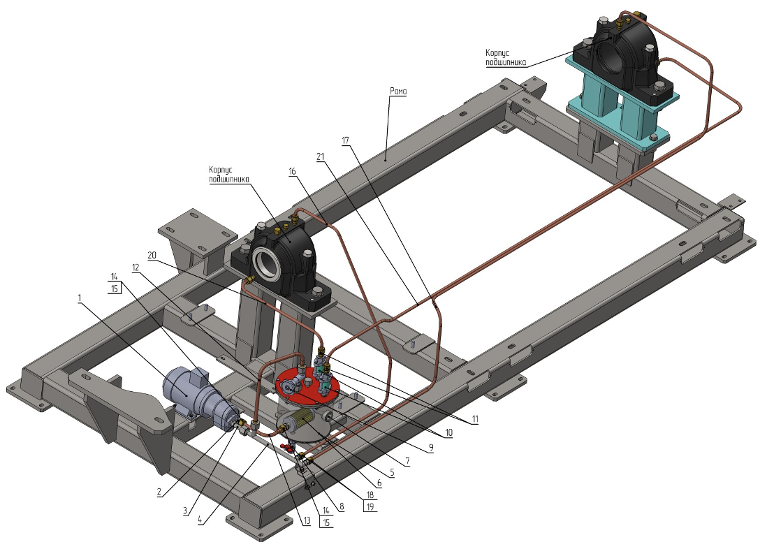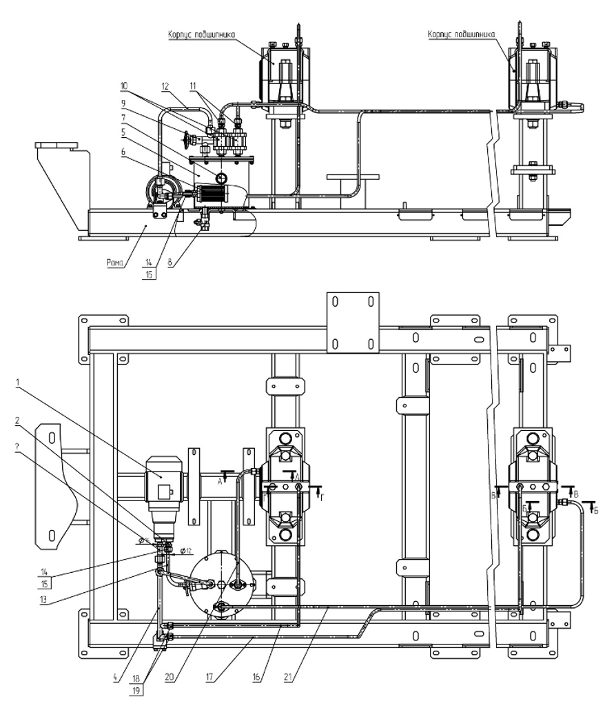 Основные элементы: 1 – Насосный агрегат БГ11-111-20 –МН176-63; 2,3 – Штуцер; 4 – Крестовина; 5 – Бачок; 6 – Фильтр всасывающий 10-80-2 ОСТ 21641-2-80..; 7 – Масло указатель круглый HVF.92 10-3/8”; 8 – Кран шаровый 11б27п1 (Ду15, Ру16); 9 – Вентиль регулирующий 15с926к1 (Ду10 ,Ру25); 10 – Визуальный индикатор потока (2 шт.); 11 – Фитинг обжимной 10-3/8’’ (2 шт.); 12 – Трубопровод дренажный; 13 – Трубопровод входной; 14 – Гайка обжимная 12-3/8” (2 шт.); 15 – Кольцо обжимное 12-3/8” (2 шт.); 16,17 – Трубопровод напорный; 18 – Гайка обжимная 10-3/8” (2 шт.); 19 – Кольцо обжимное 10-3/8” (2 шт.); 20,21 – Трубопровод сливной.