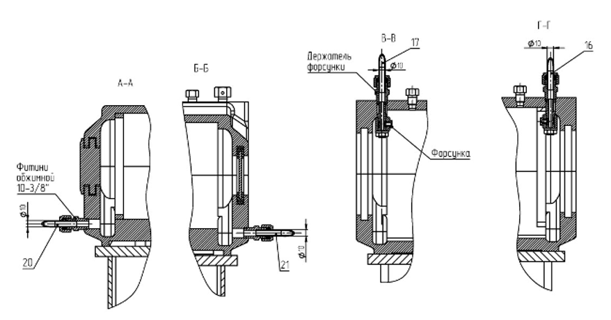 Сжатое масло через штуцер (3), крестовину (4) и напорные трубопроводы (16,17) подводится к форсункам корпусов подшипников. Напорные трубопроводы (медная труба dн=10мм) крепятся одним концом в держателях форсунок на корпусах подшипников, а другим концом на штуцерах крестовины с помощью гаек (18) и колец (19).
