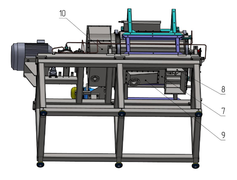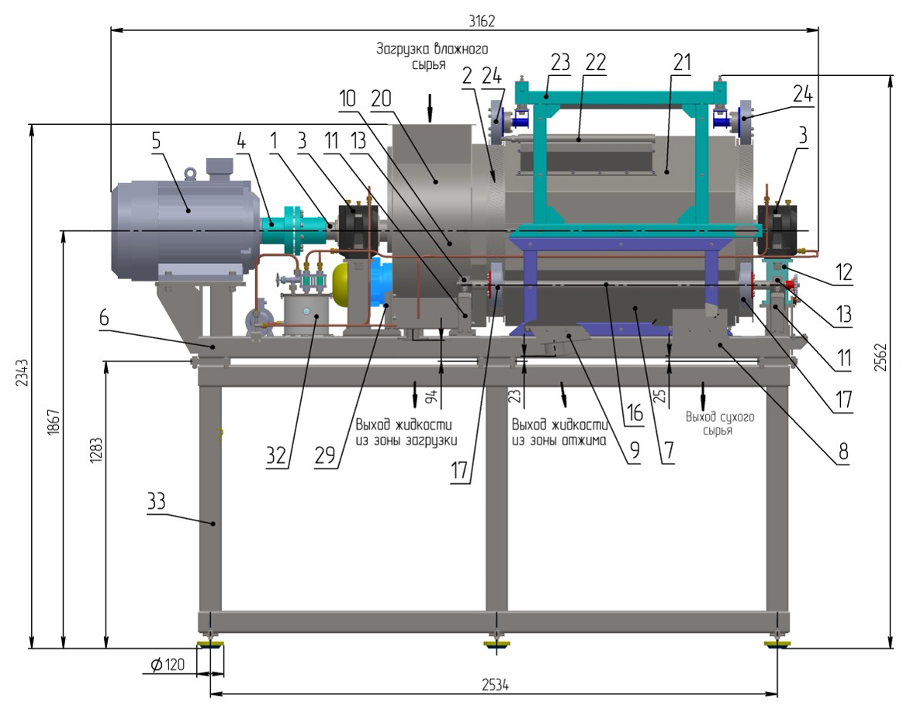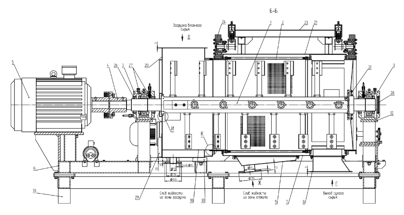 Кожух нижний (7) закрывает нижнюю часть барабана (2) в зонах отжима-выгрузки сырья. В нижней части кожуха закреплены бункер выгрузки (8), через который выводится осушенное сырьё и бункер сливной (9) для слива жидкости после отжима сырья и промывки барабана. Зоны выгрузки сырья и слива жидкости разделяются с помощью сегментов кожуха в сочетании с кольцами и обечайкой барабана. Конструктивно кожух нижний представляет собой гнутый листовой кожух с двумя окнами в нижней части. На краях кожуха и между окнами вварены сегменты, к окнам снаружи приварены фланцы для крепления бункеров слива и выгрузки. В зоне выгрузки между наружным и внутренним сегментами вварены обечайки, направляющие сырьё в бункер выгрузки. Верхняя часть кожуха имеет полки для соединения с кожухом верхним (21). С помощью приваренных к кожуху фрагментов рамы (сварная конструкция из труб) кожух нижний устанавливается на раме (6). Овальные отверстия в местах крепления позволяют перемещать кожух относительно рамы в горизонтальной плоскости, обеспечивая регулировку. На верхней части фрагментов рамы монтируется скоба прижимная (23).