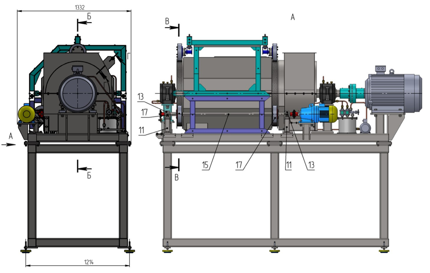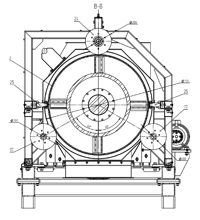Привод барабана обеспечивает вращение барабана (2) в процессе работы центрифуги и включает ряд узлов, установленных на раме. Барабан устанавливается на четырёх фиксированных роликах (17). При синхронном вращении роликов за счёт трения вращение передаётся барабану (n=4,16 об/мин).
